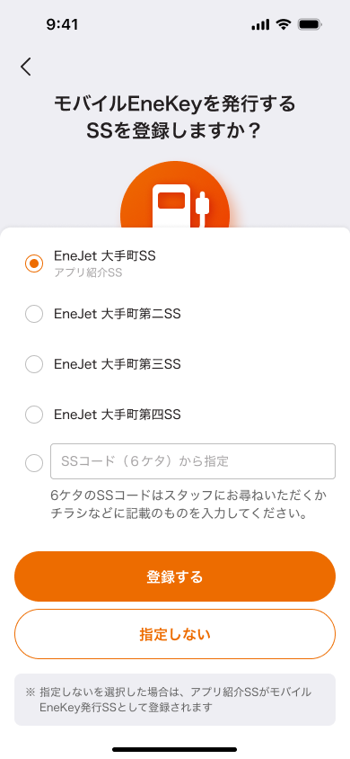 この画面では、店舗で案内されたSSコードを入力します。案内されていない場合は「持っていない」を選択します